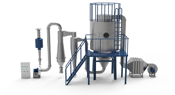 空氣通過過濾器和加熱器,進入離心噴霧干燥器頂部的空氣分配器,熱空氣呈螺旋狀均勻進入干燥器。料液由料液槽經過濾器由泵送至干燥器頂部的離心霧化器,使料液噴成極小的霧狀液滴,料液和熱空氣并流接觸,水分迅速蒸發(fā),在極短時間內干燥成成品,成品由干燥塔底部和旋風分離器排出,廢氣由風機排出。用戶可根據實際情況選定加熱方式和收塵、除塵方式。